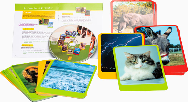 "Les cartes" : Les 36 cartes fournies sont classées par degré de difficultés de reconnaissance sonore (vert, orange et rouge). Retrouvez ces mêmes visuels sous différentes formules : à imprimer ou rétro-projeter, en version individuelles ou combinées, ..., selon vos besoins.